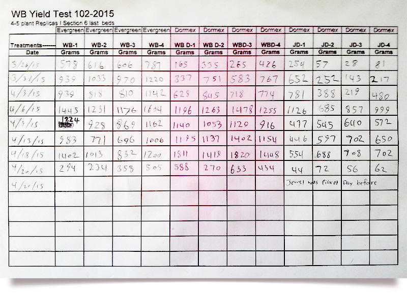 In 2016 Winter Bell had picked 16,177 lbs/ac by May 5 and still going strong when we stopped our trial. In our 2015 yield test, 18 month old evergreen Winter Bell produced an average of 5.3 lbs per bush with 3.9 lbs being harvested before April 10th. (See data sheets on left below)